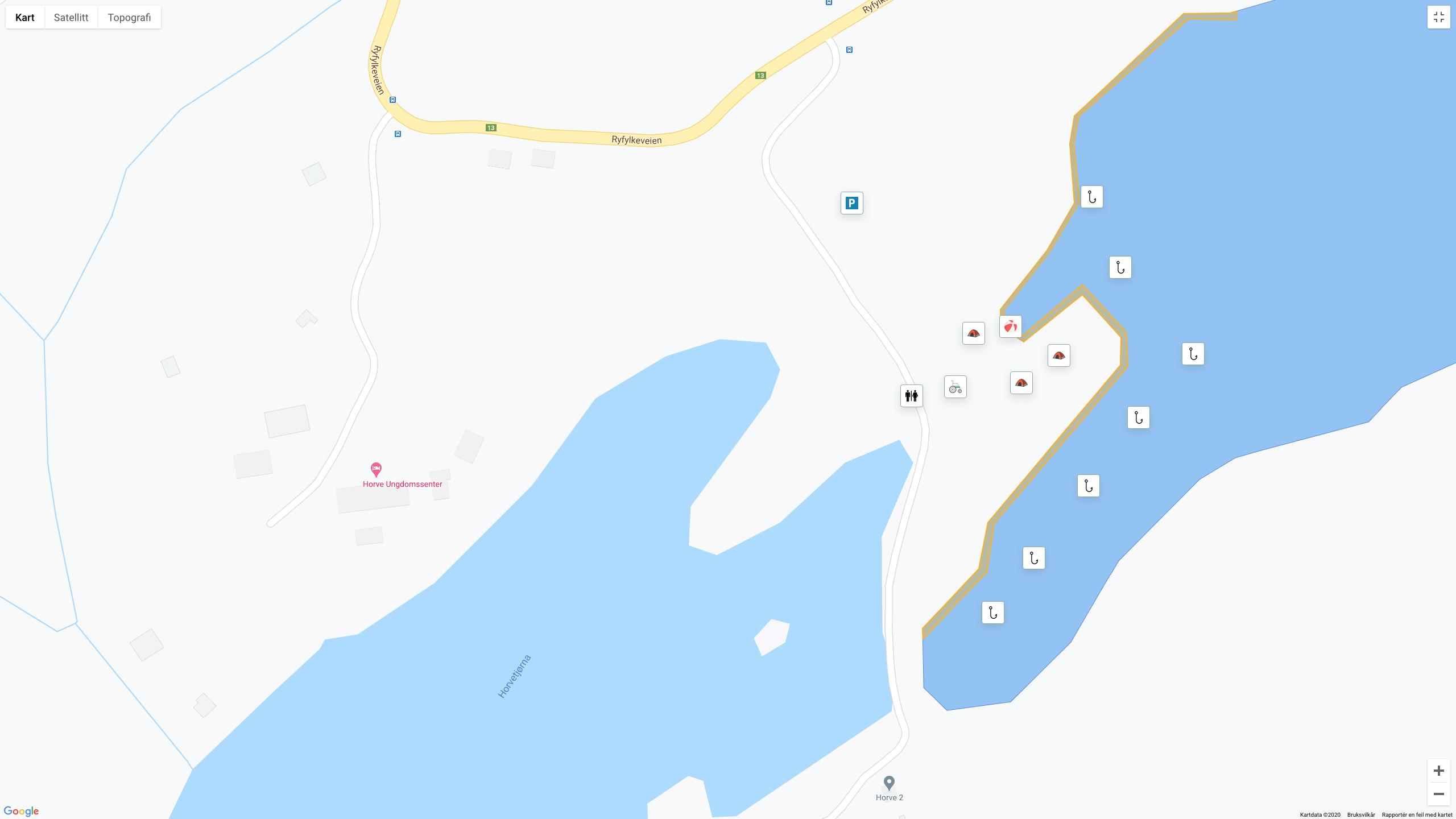 Viser informasjon om parkering, mulige teltplasser, fiskekort og mye mer. Vi viser også tilrettelagte fiskeplasser for bevegelseshemmede.